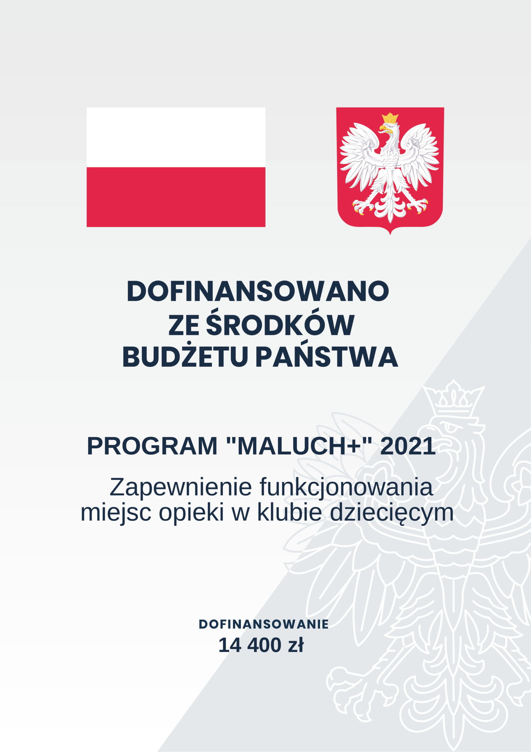 Rok 2021 jest kolejnym, w którym "Dziecięcy Zakątek" otrzymał dotację w ramach Resortowego Programu rozwoju instytucji opieki nad dziećmi w wieku do lat 3 „MALUCH+”. Program "Maluch+" wspiera rozwój instytucji opieki nad dziećmi w wieku do lat 3 - żłobków, klubów dziecięcych i dziennych opiekunów. Beneficjenci programu mogą otrzymać dofinansowanie do tworzenia i funkcjonowania miejsc opieki. "Maluch+" jest programem rocznym. Celem programu "Maluch+" jest zwiększenie dostępności terytorialnej i finansowej miejsc opieki w żłobkach, klubach dziecięcych i u dziennych opiekunów dla wszystkich dzieci, w tym dzieci niepełnosprawnych oraz wymagających szczególnej opieki. Dofinansowanie z programu wynosi 80zł na każdy miesiąc